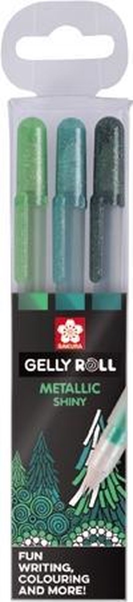 Set met 3 glanzende Metallic gelpennen in de boskleuren groen, emerald groen en jagersgroen. Geweldig om mee te tekenen, versieren en schrijven. Te gebruiken voor handlettering, bullet journaling, (wens)kaarten en nog veel meer! Gelly Roll In 1984 vond Sakura een nieuw soort inkt uit, gebaseerd op gel en die in veel prachtige kleuren gemaakt kon worden. De wereld maakte voor het eerst kennis met de gelpen, genaamd Gelly Roll, die sindsdien bekend is geworden om haar prachtige schrijfresultaat waarbij je niet hoeft te drukken. Het schrijft heerlijk en ligt soepel in de hand. Inmiddels bestaat Gelly Roll in veel soorten kleuren en effecten zoals Stardust (glitter), Metallic (glanzend) en Moonlight (fluorescerend). Superleuk voor het beschrijven van wenskaarten, maar ook voor tekenen en decoreren.