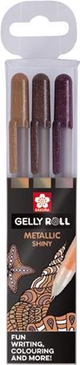 Set met 3 glanzende Metallic gelpennen in de aardekleuren bourgogne, koper en sepia. Geweldig om mee te tekenen, versieren en schrijven. Te gebruiken voor handlettering, bullet journaling, (wens)kaarten en nog veel meer! Gelly Roll In 1984 vond Sakura een nieuw soort inkt uit, gebaseerd op gel en die in veel prachtige kleuren gemaakt kon worden. De wereld maakte voor het eerst kennis met de gelpen, genaamd Gelly Roll, die sindsdien bekend is geworden om haar prachtige schrijfresultaat waarbij je niet hoeft te drukken. Het schrijft heerlijk en ligt soepel in de hand. Inmiddels bestaat Gelly Roll in veel soorten kleuren en effecten zoals Stardust (glitter), Metallic (glanzend) en Moonlight (fluorescerend). Superleuk voor het beschrijven van wenskaarten, maar ook voor tekenen en decoreren.