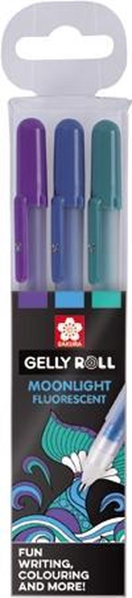 Set met 3 fluoriserende Moonlight gelpennen in de zeekleuren pastel paars, pastel groen en pastel blauw. Geweldig om mee te tekenen, versieren en schrijven. Te gebruiken voor handlettering, bullet journaling, (wens)kaarten en nog veel meer! Gelly Roll In 1984 vond Sakura een nieuw soort inkt uit, gebaseerd op gel en die in veel prachtige kleuren gemaakt kon worden. De wereld maakte voor het eerst kennis met de gelpen, genaamd Gelly Roll, die sindsdien bekend is geworden om haar prachtige schrijfresultaat waarbij je niet hoeft te drukken. Het schrijft heerlijk en ligt soepel in de hand. Inmiddels bestaat Gelly Roll in veel soorten kleuren en effecten zoals Stardust (glitter), Metallic (glanzend) en Moonlight (fluorescerend). Superleuk voor het beschrijven van wenskaarten, maar ook voor tekenen en decoreren!