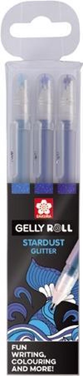 Set met 3 glitterende Stardust gelpennen in de zeekleuren blauw, luchtblauw en marineblauw. Geweldig om mee te tekenen, versieren en schrijven. Te gebruiken voor handlettering, bullet journaling, (wens)kaarten en nog veel meer! Gelly Roll In 1984 vond Sakura een nieuw soort inkt uit, gebaseerd op gel en die in veel prachtige kleuren gemaakt kon worden. De wereld maakte voor het eerst kennis met de gelpen, genaamd Gelly Roll, die sindsdien bekend is geworden om haar prachtige schrijfresultaat waarbij je niet hoeft te drukken. Het schrijft heerlijk en ligt soepel in de hand. Inmiddels bestaat Gelly Roll in veel soorten kleuren en effecten zoals Stardust (glitter), Metallic (glanzend) en Moonlight (fluorescerend). Superleuk voor het beschrijven van wenskaarten, maar ook voor tekenen en decoreren.