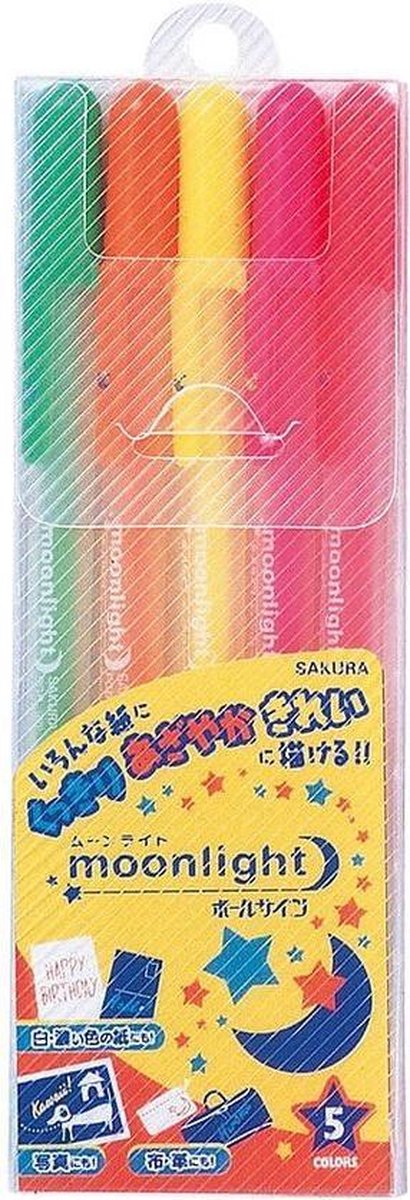 Sakura Gelly roll Moonlight - 5 stuks De Sakura Gelly roll Moonlight heeft een fluoriserende neon inkt op water basis die prachtig naar voren komt op donker papier maar ook werkt op licht papier en foto's of geglaceerd papier. Perfect te gebruiken voor lettering, journaling of crafting. 5 kleuren : Geel, Oranje, Rood, Licht blauw, blauw Voor 15:00 besteld vandaag verzonden.