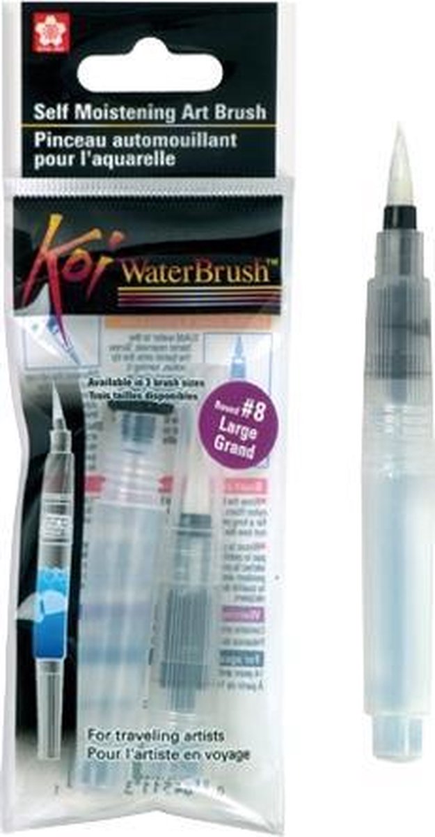 Met Koi Water Brush heb je altijd je penseel én water bij je! Ideaal om mee te aquarelleren. Het penseel met ronde, nylonpunt bevat namelijk een hervulbaar reservoir (4ml) en een dopje, zodat je deze makkelijk kunt meenemen. Doseren is eenvoudig door lichtjes in het reservoir te knijpen. Doe hetzelfde na gebruik en de Water Brush is binnen een handomdraai weer schoon. Er zijn drie verschillende penseeldiktes: small, medium en large. Deze verpakking bevat 1 hervulbaar penseel in de maat large. Je kunt Koi Water Brush ook vullen met andere vloeistoffen, zoals inkt. Kalligraferen en hand-lettering zijn zo binnen handbereik. Koi Aquarelleren gaat niet langer hand in hand met geknoei en veel tekenmateriaal. Ga erop uit en voel de ongekende vrijheid van de gebruiksvriendelijke Koi producten! Deze zijn los én samen te gebruiken. Koi Coloring Brush pennen Koi Coloring Brush pennen hebben een flexibele, stevige penseelpunt, waarmee je eenvoudig verschillende lijndiktes kunt tekenen door de