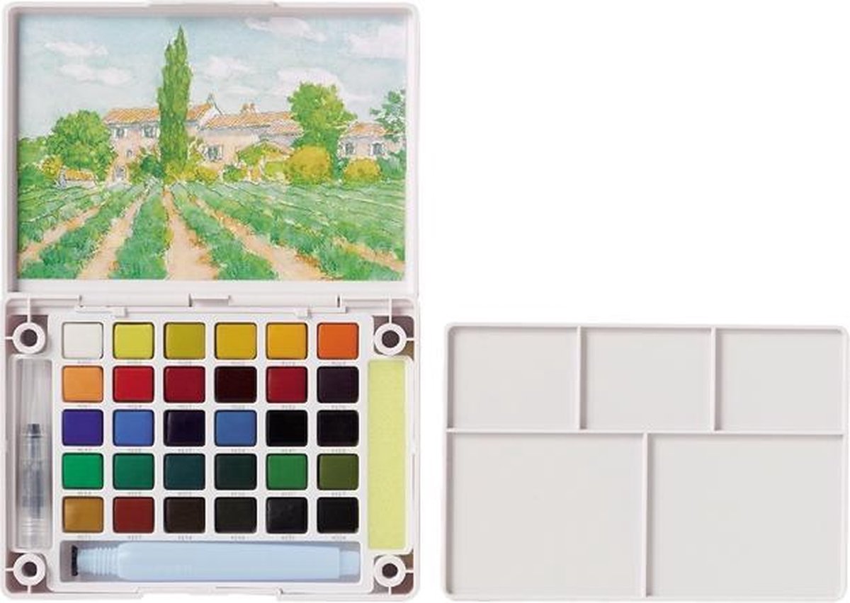 Een ultiem handige pocketbox met 30 napjes Koi aquarelverf, ideaal om mee te nemen! Deze set bevat een afneembaar palet om kleuren te mengen en de Koi Water Brush - een met water hervulbaar penseel. Zo kun je alle materialen overal met je mee nemen. Inhoud: 30 kleuren napjes aquarelverf 1 Koi Water Brush 1 afneembaar palet 1 sponsje Koi Aquarelleren gaat niet langer hand in hand met geknoei en veel tekenmateriaal. Ga erop uit en voel de ongekende vrijheid van de gebruiksvriendelijke Koi producten! Deze zijn los én samen te gebruiken. Koi Coloring Brush pennen Koi Coloring Brush pennen hebben een flexibele, stevige penseelpunt, waarmee je eenvoudig verschillende lijndiktes kunt tekenen door de druk op de punt aan te passen. Na gebruik vormt de penseelstift zich weer naar de oorspronkelijke vorm. De inkt is op waterbasis, waardoor het mogelijk is prachtige kleurovergangen te creëren door verschillende lagen over elkaar te tekenen of door de punten tegen elkaar te houden. Ook is de