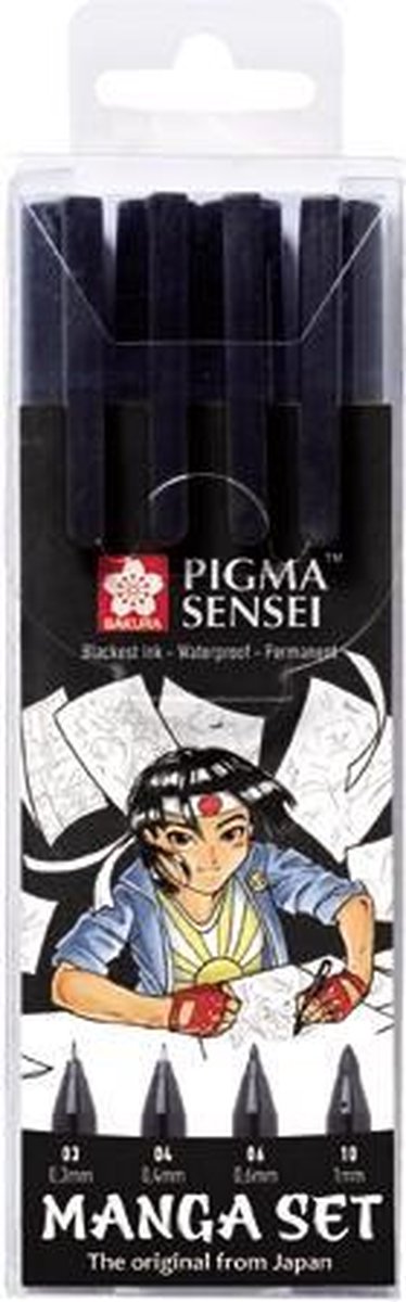 De Japanse tekentechniek "Manga" is overgewaaid naar Europa! Deze Pigma Sensei pennen hebben de belangrijkste uiteindes voor Manga: - 1 fineliner met 0,3 mm punt - 1 pen met 0,4 mm plastic punt - 1 pen met 0,6 mm vezelpunt - 1 pen met 1,0 mm vezelpunt De diepzwarte pigmentinkt op waterbasis is lichtecht en water- en vlekbestendig.