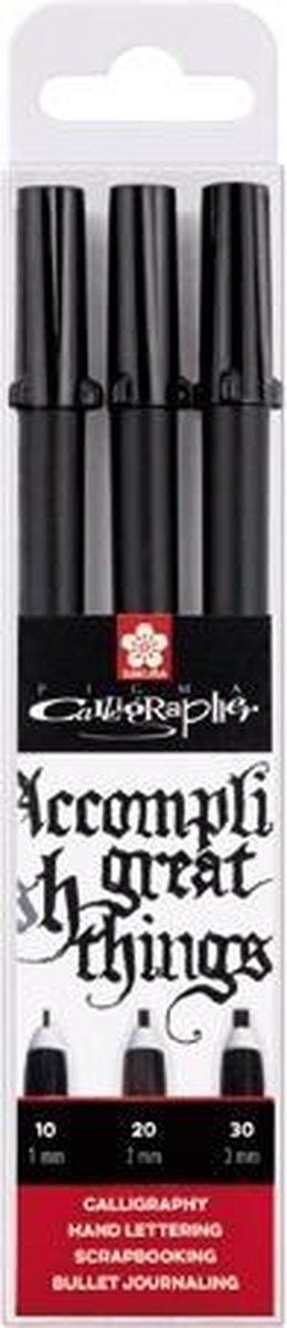 Pigma Calligrapher is een handige kalligrafiepen die op dezelfde manier gebruikt kan worden als een gewone fineliner. Geen opzetstukjes en geknoei met inkt. Deze Pigma Calligrapher set bevat alle puntdiktes van 1, 2 en 3 mm. Zo kun je fijne, medium en brede kalligrafielijnen creëren. Pigma In 1982 ontdekte en patenteerde Sakura een unieke formule voor inkt die op alle facetten zó kwalitatief goed en chemisch complex is dat deze sindsdien wereldwijd de kwaliteitsstandaard is geworden voor betrouwbare, permanente, archiveerbare inkt. Deze inkt, die gewaardeerd wordt om zijn kleurechtheid en resistentie tegen chemicaliën, kreeg de naam PIGMA. PIGMA inkt is verkrijgbaar in diverse kleuren en pensoorten, zoals Sakura Pigma Micron (fineliners, in zeven lijndiktes), Sakura Pigma Brush (penseelstiften) en Sakura Pigma Graphic (stiften met kogel- en beitelvormige punten). Deze zijn elk geschikt zijn voor talloze artistieke, functionele en technische toepassingen. Het zijn dan ook niet