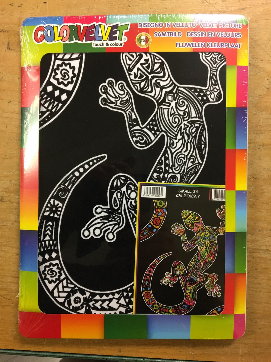 Salamander Colorvelvet kleurpakket inclusief 12 stiften. Wat is Colorvelvet? Met Colorvelvet maak je de mooiste kunstwerken maar niet zoals de standaard kleurplaten. De tekeningen zijn gemaakt van een speciaal absorberend karton, gedeeltelijk bedekt met een 1mm dikke zwarte laag fluweel waardoor je een duidelijke scheiding krijgt met hetgeen wat je moet inkleuren. Behalve dat dit stuk fluweel ervoor zorgt dat je de witte vlakken makkelijk kunt inkleuren komt het zwarte fluweel naar voren wat een heel chique geheel geeft op je Colorvelvet kleurplaat. Deze tekeningen zijn eenvoudig, dit maakt Colorvelvet leuk en leerzaam waardoor dit ideaal is voor alle leeftijden vanaf 3 jaar en ouder. Met colorvelvet hebben kinderen plezier en leren ze tegelijkertijd, waardoor ze kleurrijke tekeningen maken waarmee ze ook hun slaapkamer kunnen versieren. Maar ook voor volwassenen is Colorvelvet zeer geschikt om lekker creatief bezig te zijn. De tekeningen kan je op allerlei verschillende manieren