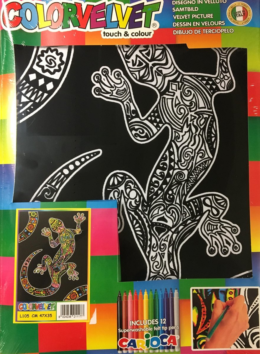Colorvelvet kleurpakket inclusief 12 stiften. Wat is Colorvelvet? Met Colorvelvet maak je de mooiste kunstwerken maar niet zoals de standaard kleurplaten. De tekeningen zijn gemaakt van een speciaal absorberend karton, gedeeltelijk bedekt met een 1mm dikke zwarte laag fluweel waardoor je een duidelijke scheiding krijgt met hetgeen wat je moet inkleuren. Behalve dat dit stuk fluweel ervoor zorgt dat je de witte vlakken makkelijk kunt inkleuren komt het zwarte fluweel naar voren wat een heel chique geheel geeft op je Colorvelvet kleurplaat. Deze tekeningen zijn eenvoudig, dit maakt Colorvelvet leuk en leerzaam waardoor dit ideaal is voor alle leeftijden vanaf 3 jaar en ouder. Met colorvelvet hebben kinderen plezier en leren ze tegelijkertijd, waardoor ze kleurrijke tekeningen maken waarmee ze ook hun slaapkamer kunnen versieren. Maar ook voor volwassenen is Colorvelvet zeer geschikt om lekker creatief bezig te zijn. De tekeningen kan je op allerlei verschillende manieren inkleuren, het
