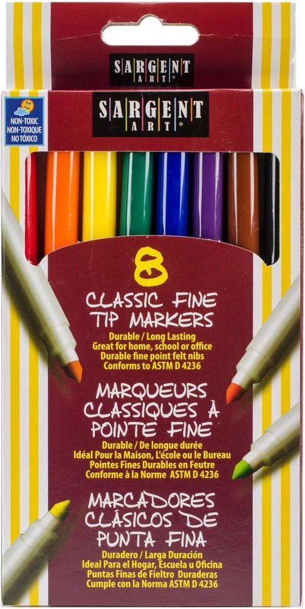 Ontworpen met briljante kleurformuleringen om langdurige levendige kleuren en uren plezier te produceren. Gebruik voor het illustreren, kleuren van viltborden of kleurboeken. Niet giftig. Beschikt over een unieke, duurzame viltstift die kan worden gebruikt om zowel bredere als dunnere lijnen te creëren. Dit pakket bevat 8 klassieke fijne punt markers