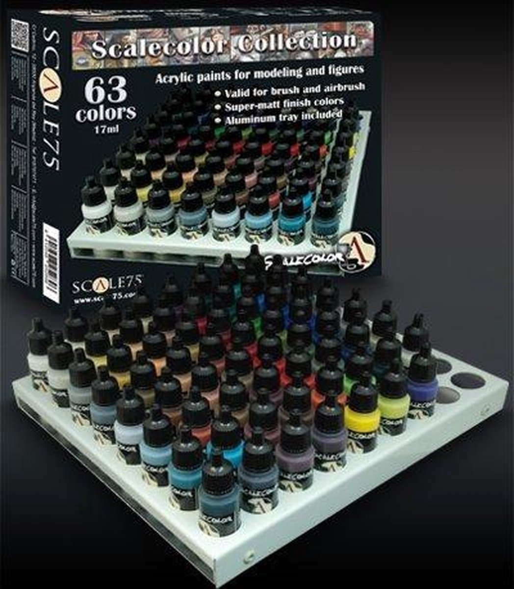 Scale 75 Scalecolor Collection bevat 63 potjes Scalecolor acrylverf van 17ml. Deze verf kan zowel met het penseel als met de airbrush verwerkt worden en heeft een goede dekkracht en vloeit prettig. De set bestaat uit deze 63 kleuren: Black, White, Nacar, Graphite, Anthartic Grey, Artic Blue, Bering Blue, Caspian Blue, Abyssal Blue, White Sands, Tenere Yellow, Sahara Yellow, Gobi Brown, Dubai Brown, Kalahari Orange, Adriatic Blue, Eclipse Grey, Pale Skin, Light Skin, Golden Skin, Basic Flesh, Pink Flesh, Arabic Shadow, Indian Shadow, African Shadow, Birch, Sandalwood, Iroko, Orange Leather, Walnut, Red Leather, Brown Leather, Black Leather, Sunset Purple, Fuchsia, Deep Red, Blood Red, Antares Red, Aldebaran Red, Mars Orange, Sol Yellow, Black Forest Green, Boral Green, Irati Green, Sherwood Green, Ardennes Green, Field-Gray, Spring Green, Fall Green, Caribbean Blue, Sky Blue, Mediterranean Blue, Tesla Blue, Cantabric Blue, Navy Blue, Deep Blue, Violet, Petroleum Gray, Graphene Gray,