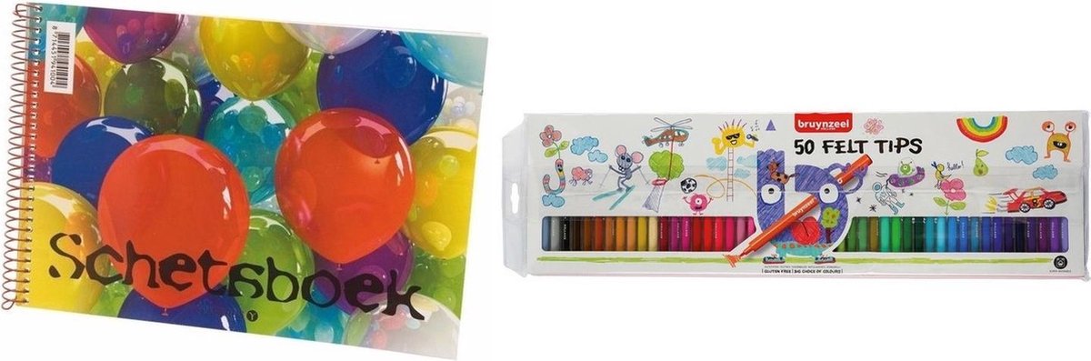 Schetsboek/tekenboek/tekenpapier wit papier A3 Ballon met 50 viltstiften. Schetsboek met 20 vellen wit papier in A3 formaat en een mapje met 50 viltstiften. Dit schetsboek houdt uw tekeningen bij elkaar door een ringband. A3 formaat vel: 29,7 x 42 cm.