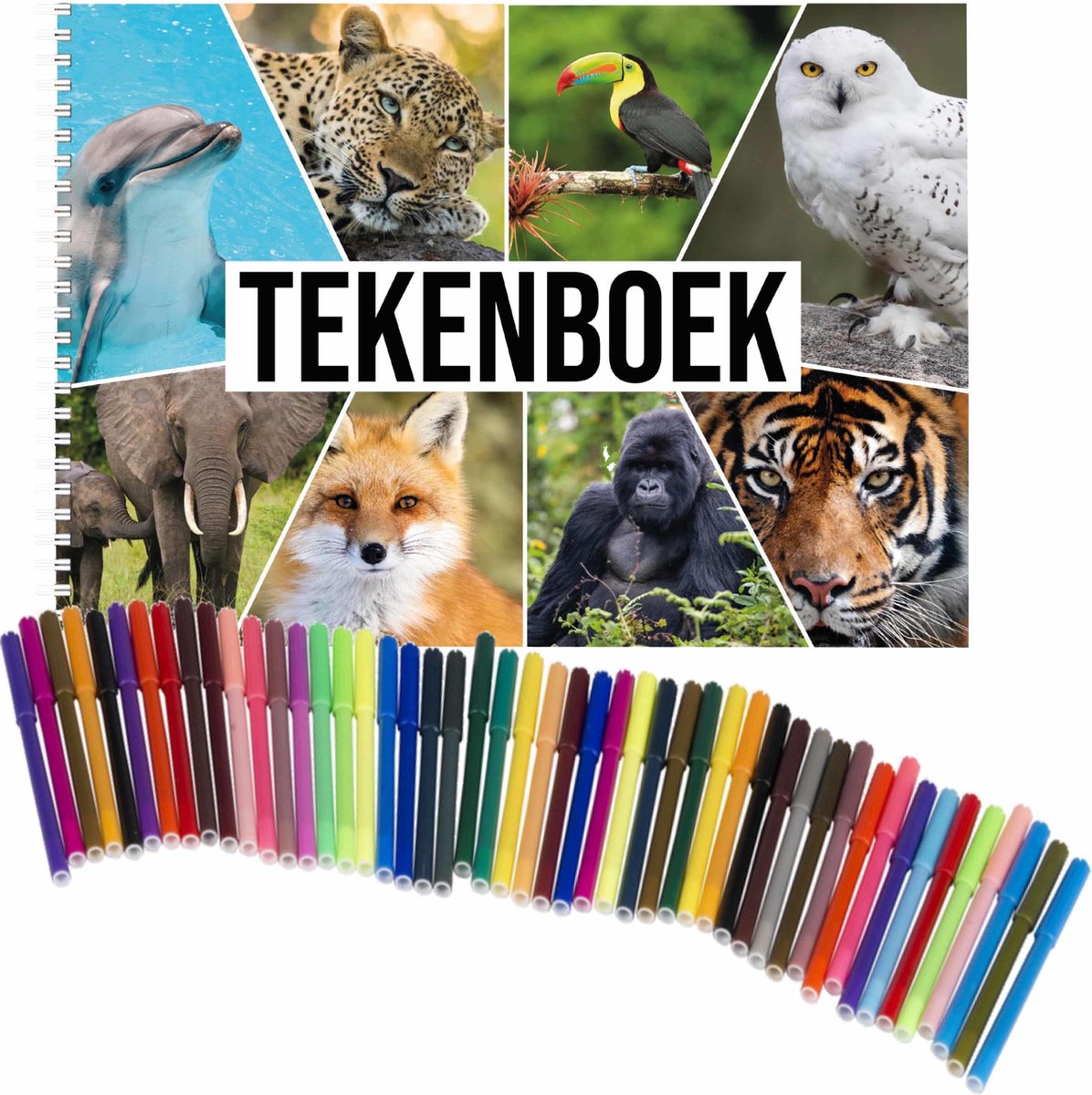 Schetsboek Dieren liefhebbers A4 50 paginas met 50 viltstiften. Dieren thema schetsboek/ tekenboek/ kleurboek/ schetsblok wit papier A4. Mooi schetsboek met stevig/ plastic voorblad met een mooie wilde Dieren bedrukking. Het A4 schetsblok bevat 50 vellen wit 80 grams papier. Dit schetsboek voor volwassenen of kinderen houdt al uw tekeningen/ schetsen bij elkaar door een witte ringband. Leuk en creatief cadeau voor meisjes die van Dieren houden. De plastic stiften worden geleverd in een etui. Eventuele stiftvlekken zijn te verwijderen bij 40 graden wassen. Kleuren creatief speelgoed voor kinderen. bestaande uit 1x 50x Gekleurde viltstiften in etui, 1x A4 dieren waaier schetsboek/ tekenboek/ kleurboek/ schetsblok wit papier