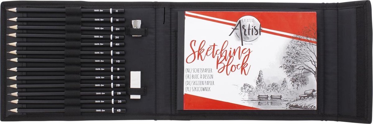 Creative Artist Schetsset: Een handig etui met daarin 10 potloden, 3 x getint houtskool, 1 gum, 1 metalen puntenslijper en 1 schetsboek. Start met tekenen en schetsen met behulp van deze uitgebreide set. Laat je creativiteit de vrije loop en zet het met de juiste tools op papier.