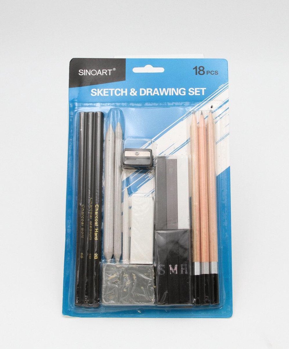 18-delige schetsset. Inhoud: 3 houtskoolpotloden: 2B / 4B / 6B 3 potloden: HB / 2B / 4B 3 papieren wissers, verschillende diktes 3 houtskool: zacht, medium en hard 3 pastelkrijt: grijs, lichtgrijs en wit 1 slijper 1 gum 1 kneedgum