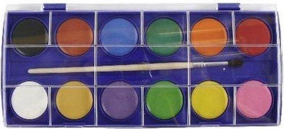 Schilder waterverf set 12 kleuren met penseel. Dit palet bevat 12 kleuren waterverf en een penseel. Het formaat van het doosje is 21 x 9,5 x 1 cm en is gemaakt van kunststof. Hobby/knutsel schildersmateriaal benodigdheden. Gekleurde verf op waterbasis.