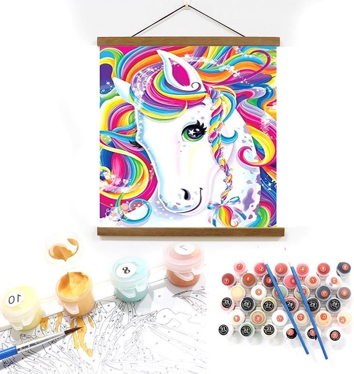 Halve frame design met twee houten steunen voor het mooi en proper hangen Prachtig canvas van hoge kwaliteit met suede koord. Modern ontwerp Acrylverf Alle kleuren zijn klaar voor gebruik. Mengen is niet nodig. Meerdere kleurpotten aanwezig voor de dominante kleuren. 4 borstels verkrijgbaar in verschillende maten Gemakkelijke / gemiddelde moeilijkheidsgraad - verbluffend resultaat Geschikt voor kinderen (vanaf 6 jaar), ouders, grootouders. Groot gnoeg cijfers en gebieden met hoge zichtbaarheid Ontspannende activiteit om alleen of met anderen te doen. Activiteit die door beginners kan worden uitgevoerd met een resultaat dat kan worden gebruikt als decoratie van goede kwaliteit. Schildertips: Begin altijd met de lichtste kleuren. Hierdoor kunnen de donkere kleuren de lichte kleuren aan de randen bedekken. Schilder na het drogen een tweede laag om ervoor te zorgen dat de cijfers niet meer zichtbaar zijn Om te voorkomen dat houten steunen worden geverfd, kan het raadzaam zijn deze