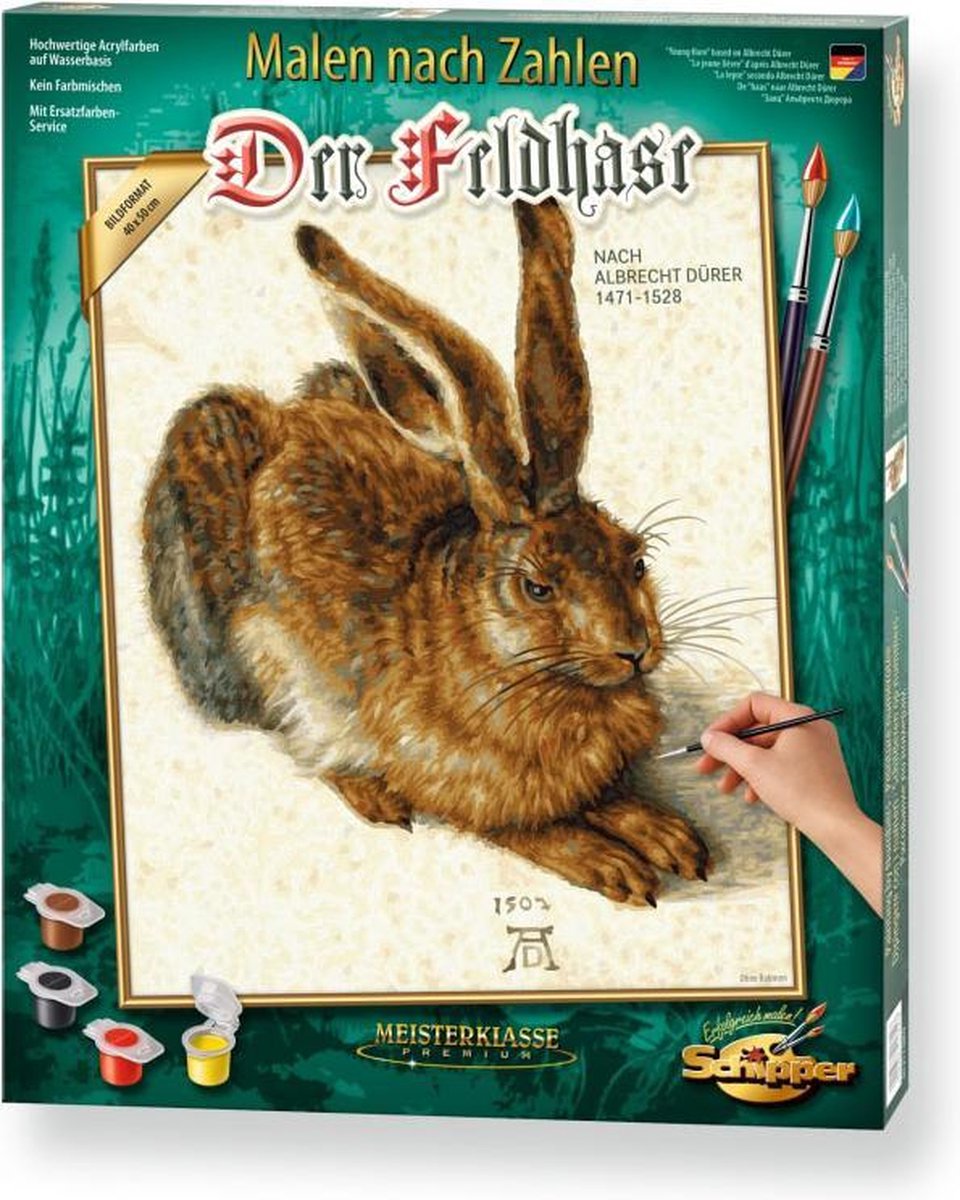 Haas Het motief: De "haas" naar Albrecht Dürer 1471 - 1528 Welke hobbyschilder droomt er niet van zo te kunnen schilderen en tekenen als Albrecht Dürer? Hij was een meester van de detailgetrouwe en haast fotografische weergave van mensen, dieren en landschappen. Zo lijkt ook zijn beroemde aquarel "Haas" bijna een foto. Met de techniek Schilderen op nummers wordt dit meesterwerk een spectaculair motief voor de hobbyschilder, zonder dat daarbij de fascinatie van het beroemde origineel verloren gaat. Een "must-have" voor iedere hobbykunstenaar. Beeldformaat en schildervoorbeeld: “MEESTERKLASSE Premium”. Schilderijen in staand formaat of landschapsformaat van 40 x 50 cm, naast of onder elkaar gegroepeerd, zijn bijzonder geschikt voor een schilderijenverzameling. Het schildervoorbeeld heeft een voel- en zichtbare linnenstructuur. Daardoor wordt het schilderij uiteindelijk niet alleen mooier, maar wordt ook het geschilderde karakter van de afbeelding onderstreept en het gewenste
