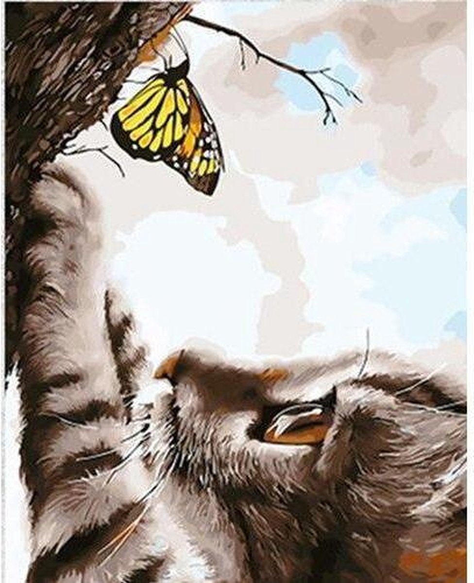 Schilderen op Nummer Kat en een vlinder - 50x65cm - Op Lijst Gemonteerd (36 kleurtjes)