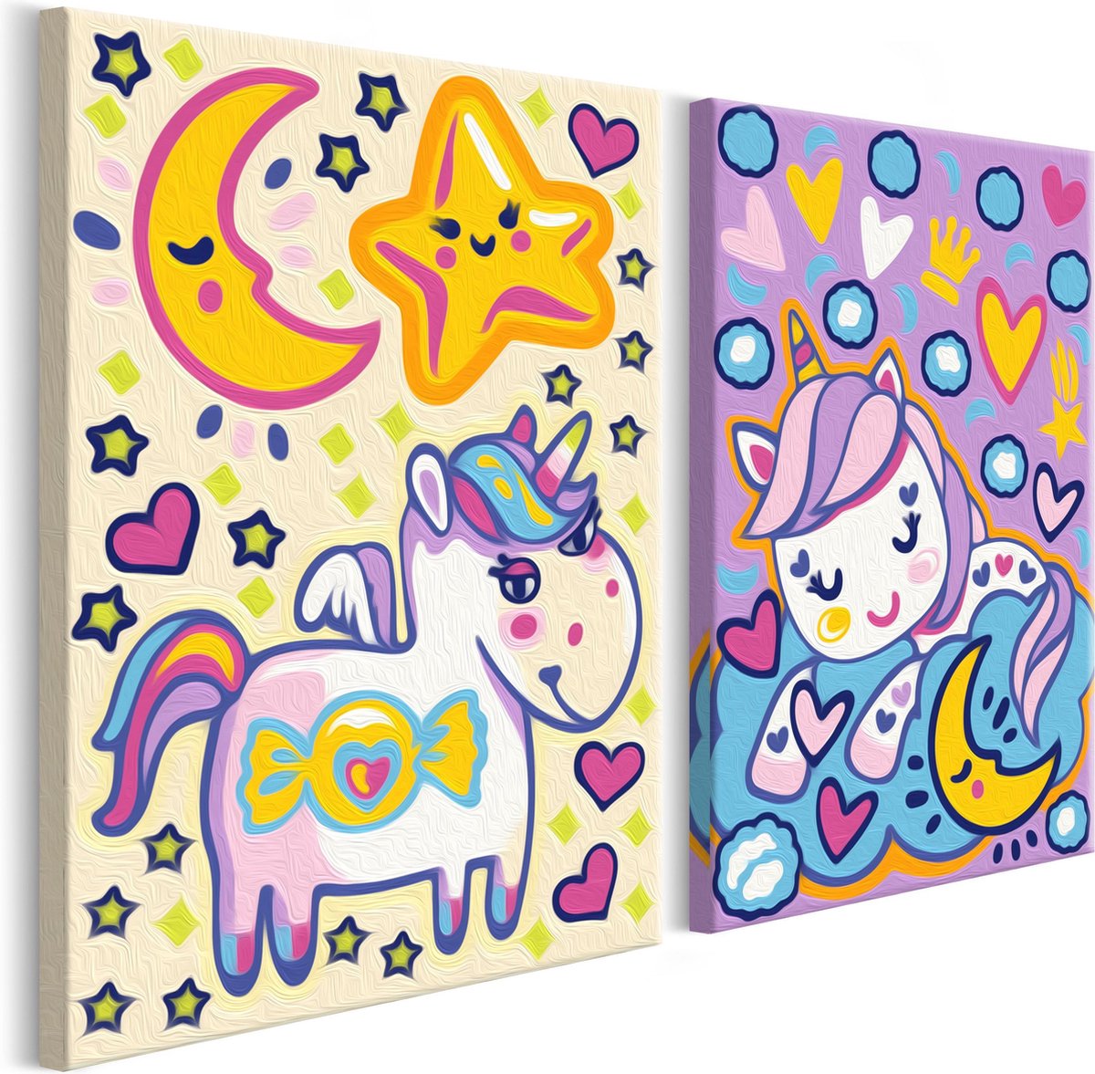 Ontwaak uw creativiteit Als u wilt dat uw kind zijn vrije tijd op een creatieve manier doorbrengt door zijn manuele vaardigheden en zijn talent als kleine artiest te ontwikkelen, dan hebben wij iets voor u! Schilderkit voor kinderen Unicorns (Good Morning & Good Night). Als uw kind graag wil tekenen of kleuren zal hij of zij onze schilderijenset Unicorns (Good Morning & Good Night) zeer op prijs stellen. Het schilderij op zich is een ideaal cadeau-idee om de kamer van het kind te versieren. De schattige kleine dieren en de sprokkjesfiguren wachten op de penseelstreek. Voor kinderen van 7 tot 9 jaar presenteren wij een complete schilderijenset wat vermaakt en ontwikkelt tegelijkertijd. De set bevat: Schemapatroon met gekleurde velden - om uw kind te helpen schilderen Professionele borstel Een set acrylverf in containers, speciaal geselecteerd op het door u gekozen patroon Diagram patroon met gekleurde velden - om uw kind te helpen om te schilderen Het heilzame effect van schilderen