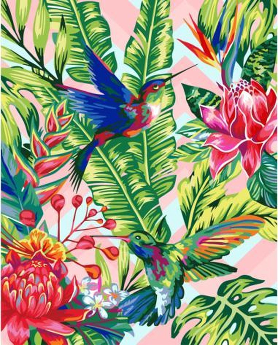 Wizardi paint by numbers KOLIBRIES, Afmeting 40 x 50 cm. OPGESPANNEN CANVAS OP HOUT. Penselen en voldoende acrylverf. Vernis en instructies in het NEDERLANDS
