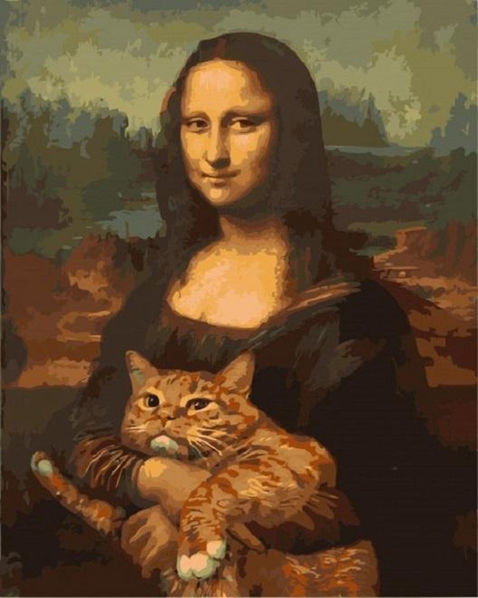 PAINT BY NUMBER MONA LISA WITH CAT 50 x 40 cm MS 7760 Schilderen op nummer pakket Canvas gespannen op hout. Verpakt in leuke kadodoos. Inclusief duidelijke gebruiksaanwijzing met fotos op de doos. Verf, kwastjes en voorbeeldblad.
