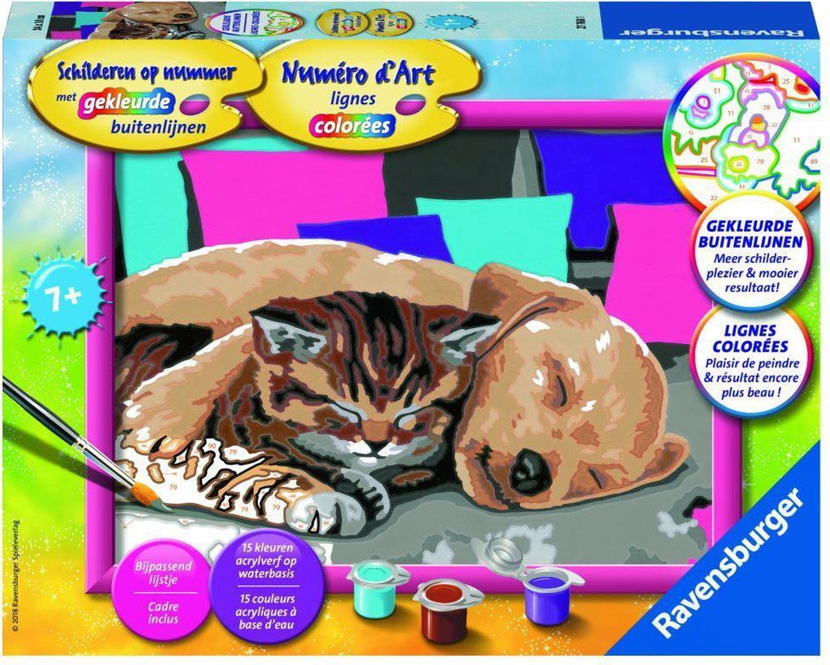 Schilderen op nummer van Ravensburger - iedereen kan schilderen! Dankzij de gekleurde buitenlijnen kunnen kinderen de afbeelding van de Slapende vrienden en de benodigde kleuren sneller herkennen. Zo is het kinderlijk eenvoudig de kunstenaar in jezelf wakker te maken! Met grote schilderoppervlakken en veel verschillende kleuren zijn de schilderplaten van de schilderen op nummer Classic-serie van Ravensburger zeer geschikt voor de jonge kunstenaar. Uitpakken en aan de slag! Onze acrylverf: • droogt snel • is op waterbasis • ruikt niet onaangenaam • maakt penseelreiniger overbodig