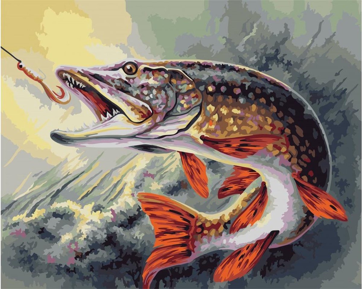 Schilderen op nummer - Snoek - Wizardi (T090) Afmeting : 40 x 50 cm Opgespannen canvas op board Penselen en voldoende acryl verf (hoeft niet gemengd te worden) Vernis en instructie (nederlands)