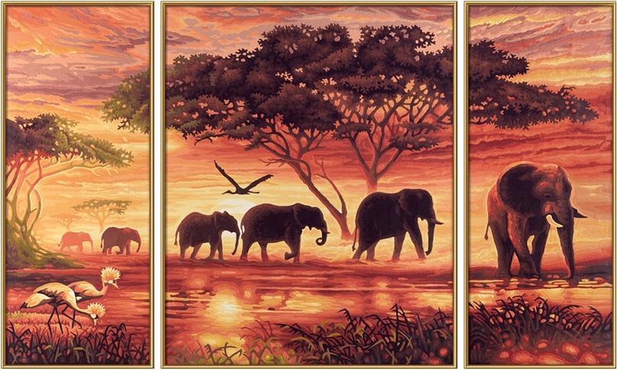 Door de voorbedrukte nummers kan iedereen dit prachtige drie-delige schilderij van een stoet olifanten maken. Inhoud Schilderen op Nummer: 50 x 80 cm voorbedrukt schilderbord met linnenstructuur Voorgemengde verf Kwaliteitskwast Controleblad met gedetailleerde instructies voor het schilderen