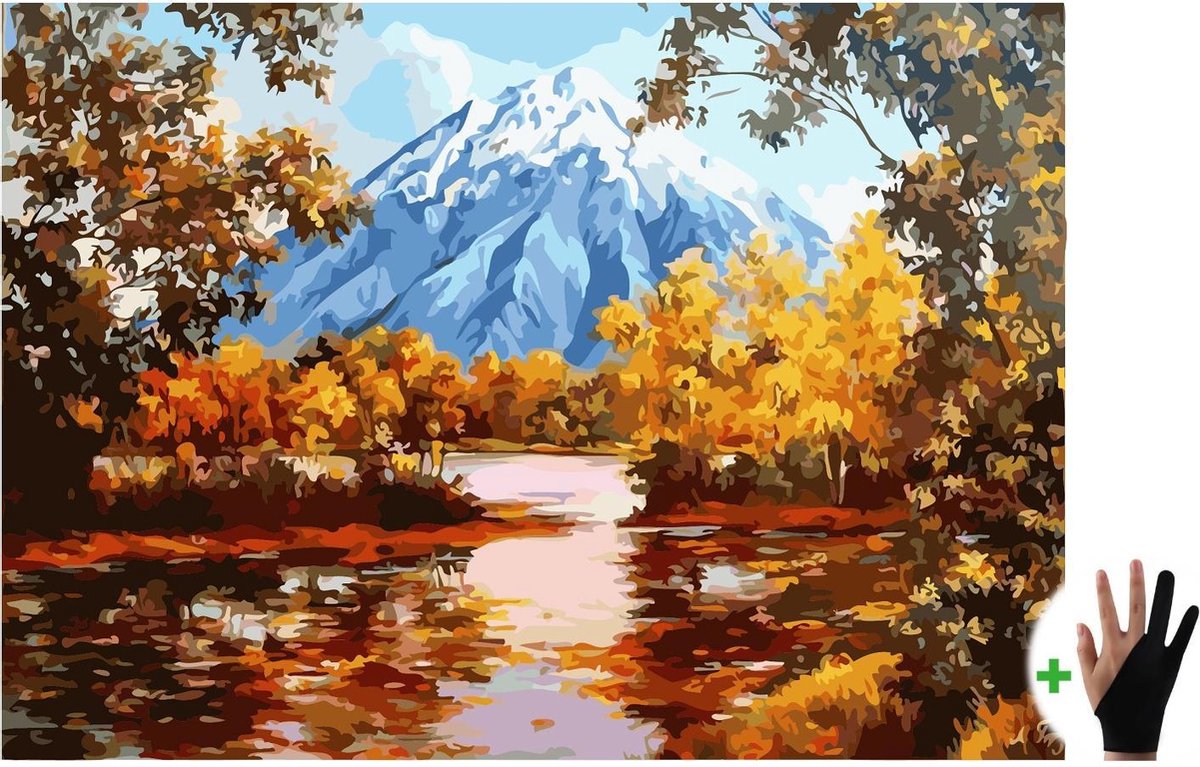 Schilderen Op Nummer Volwassenen Bergen Herfst Rivier – 50x40 cm - Inclusief Tekenhandschoen - Paint By Number Volwassenen