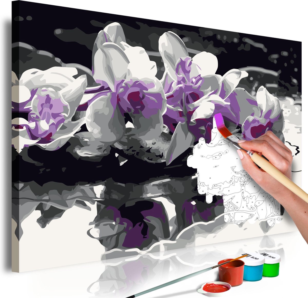 Ontwaak uw creativiteit Wilt u creatief ontspannen? Op zoek naar een origineel avontuur, waar u ook uw dierbaren kunt uitnodigen? Tegelijkertijd wordt u wakker van uw creativiteit en voelt u zich een echte kunstenaar. Niets is makkelijker ! Ontdek de meest originele hobby van dit jaar - schilderen op nummers . Een kleurrijke schilderij kit door nummers Purple Orchid (Black Background & Reflection In The Water) is een ongebruikelijk idee voor het besteden van vrije tijd. Schilderij kit door nummers Purple Orchid (Black Background & Reflection In The Water) is een activiteit voor mensen van alle leeftijden. Perfect voor amateur schilders! Dit schilderij zal perfect zijn als wandversiering. We presenteren een complete schilderkit voor volwassenen en ambitieuze kinderen ouder dan 12 jaar. De set bevat: Schemapatroonmet gekleurde velden - om uw kinderen te helpen schilderen 2 borstels met verschillende borsteldiktes Een set acrylverf in containers, speciaal geselecteerd voor het door u