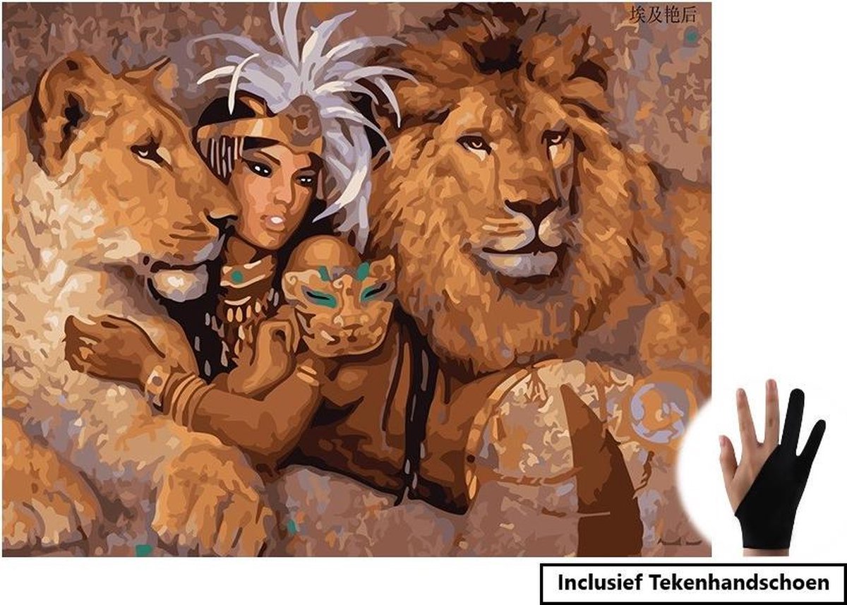 Schilderen Op Nummer Volwassenen Egyptische Godin Met Leeuw En Tijger Dieren – 50x40 cm - Inclusief Tekenhandschoen - Paint By Number Volwassenen