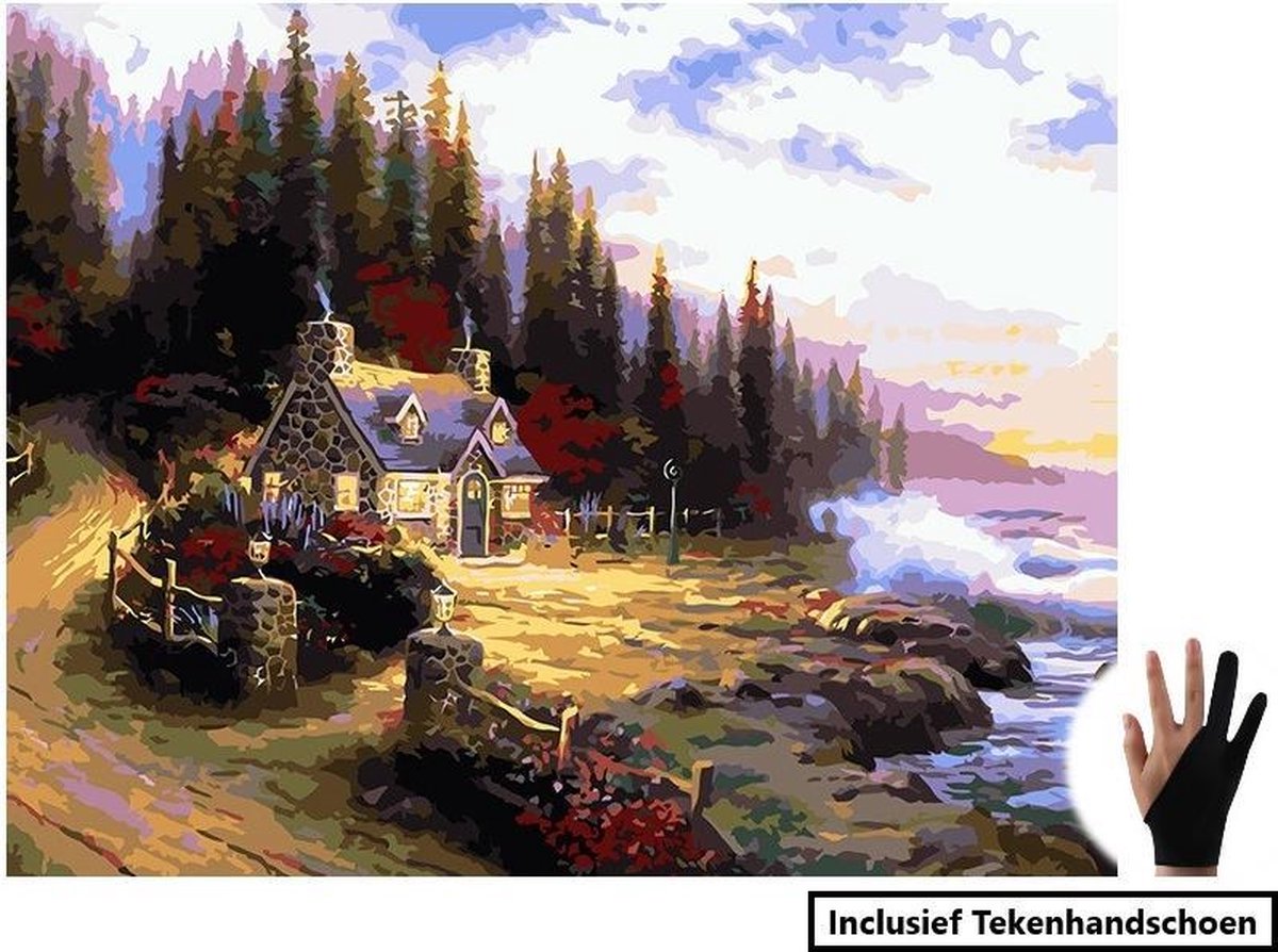 Schilderen Op Nummer Volwassenen Huisje In Het Bos Natuur Landschap – 50x40 cm - Inclusief Tekenhandschoen - Paint By Number Volwassenen