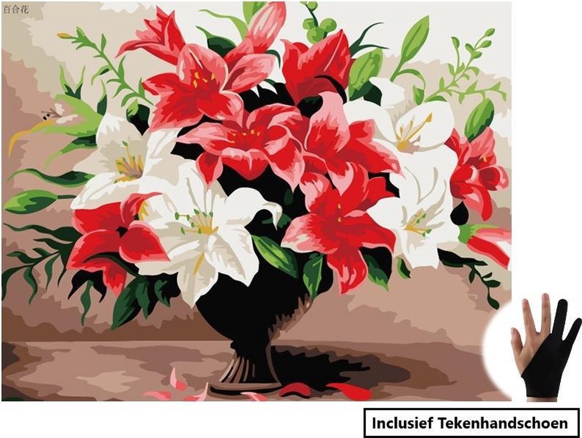 Schilderen Op Nummer Volwassenen Lelies In Vaas Bloemen – 50x40 cm - Inclusief Tekenhandschoen - Paint By Number Volwassenen