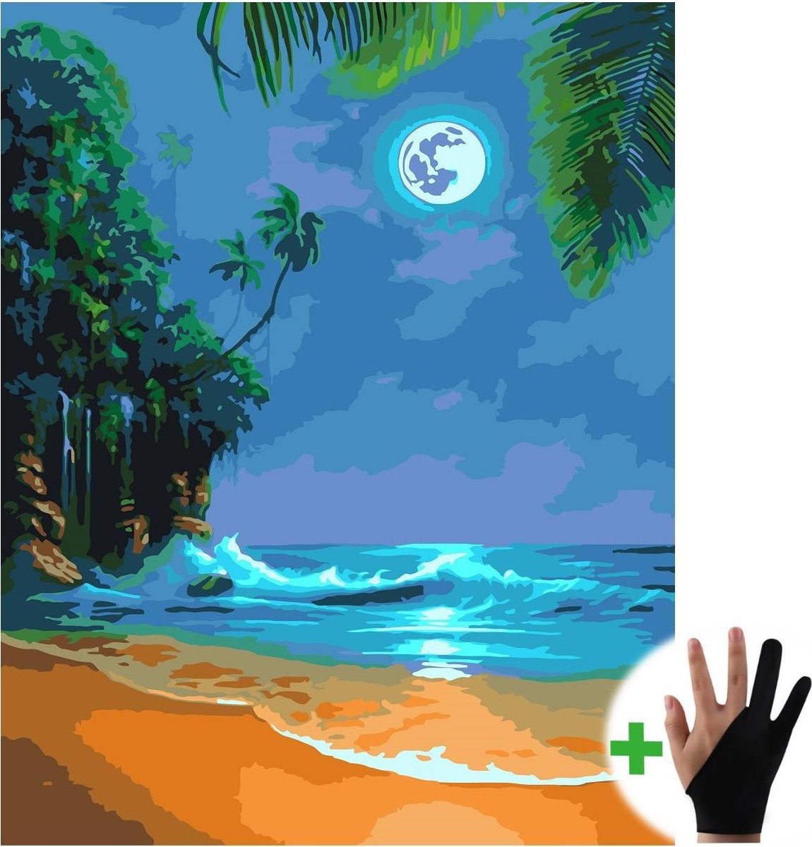 Schilderen Op Nummer Volwassenen Maan Tropisch Eiland Strand Zee – 40x50 cm - Inclusief Tekenhandschoen - Paint By Number Volwassenen