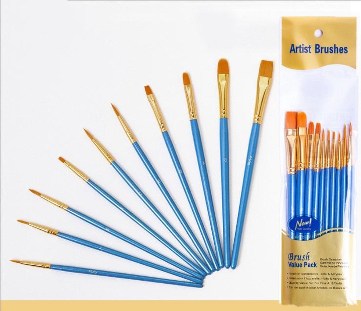 Kom je weleens penselen tekort bij het schilderen op nummer of wil jij met een fijner of juist dikker / breder kwastje jouw muurdecoratie maken? Dan is deze set ideaal voor jou! Altijd de juiste penselen binnen handbereik Deze penselen set bestaat uit 10 verschillende penselen. Van dik tot dun en van smal tot breed. Over het algemeen zijn er maar 3 penselen toegevoegd aan een set voor schilderen op nummer, ook wel bekend als painting by number. Deze set biedt jou het gemak van de variatie in de grootte zodat je zelf kunt kiezen met welk kwastje je het schilderij maakt. Ook biedt deze set jou de mogelijkheid om met meer verschillende kleuren tegelijk te werken zonder elke keer je penseel schoon te moeten maken. Geschikt voor; - Aquarelverf - Acrylverf - Olieverf - Plakkaatverf Handig in gebruik en gemakkelijk weer schoon te maken. Wil je ook je eigen set bemachtigen om verschillende effecten te kunnen creeeren met verschillende penselen, bestel dan nu en ontvang de set binnen 2