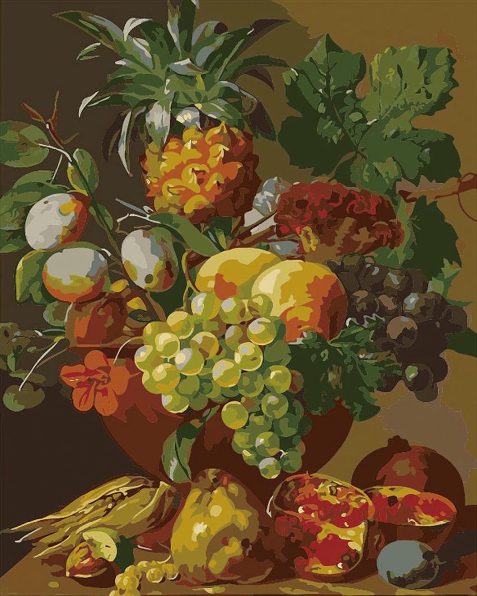 Schilderen op nummer is de perfecte hobby voor de creatieveling van nu. Het is namelijk niet alleen ongelofelijk ontspannend, maar het levert vaak ook nog eens een heel mooi eindresultaat op: een resultaat dat vaak letterlijk om in te lijsten is! Maar wat schilderen op nummer nu eigenlijk? Schilderen op nummer, verven op nummer, of in het Engels painting by number is het grote - volwassen! - broertje van wat de kleurplaat (met nummers) is voor kinderen. Bij painting by number zijn de kleurpotloden of -stiften echter ingewisseld voor kwasten en acrylverf en het kleurboek voor een linnen canvas. Op dit canvas staat vervolgens een in tientallen vakjes opgedeelde afbeelding, in dit geval de bovenstaande afbeelding 'Fruitstilleven' van Diamond Hobbies. De nummers die in deze vakjes staan, corresponderen met de nummers op de bijgeleverde potjes verf. En dan is het een kwestie van schilderen! Als jij alle vakjes vult met de daarvoor bedoelde kleur verf, dan eindig je namelijk vanzelf met