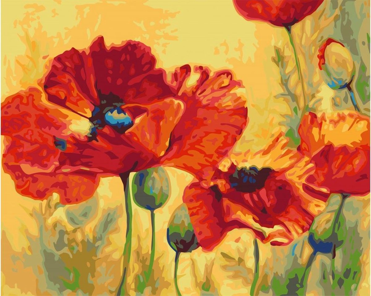Schilderen op nummer - FIELD OF POPPIES Afmeting : 40 x 50 cm Opgespannen canvas op board Penselen en voldoende acryl verf (hoeft niet gemengd te worden) Vernis en instructie (nederlands)