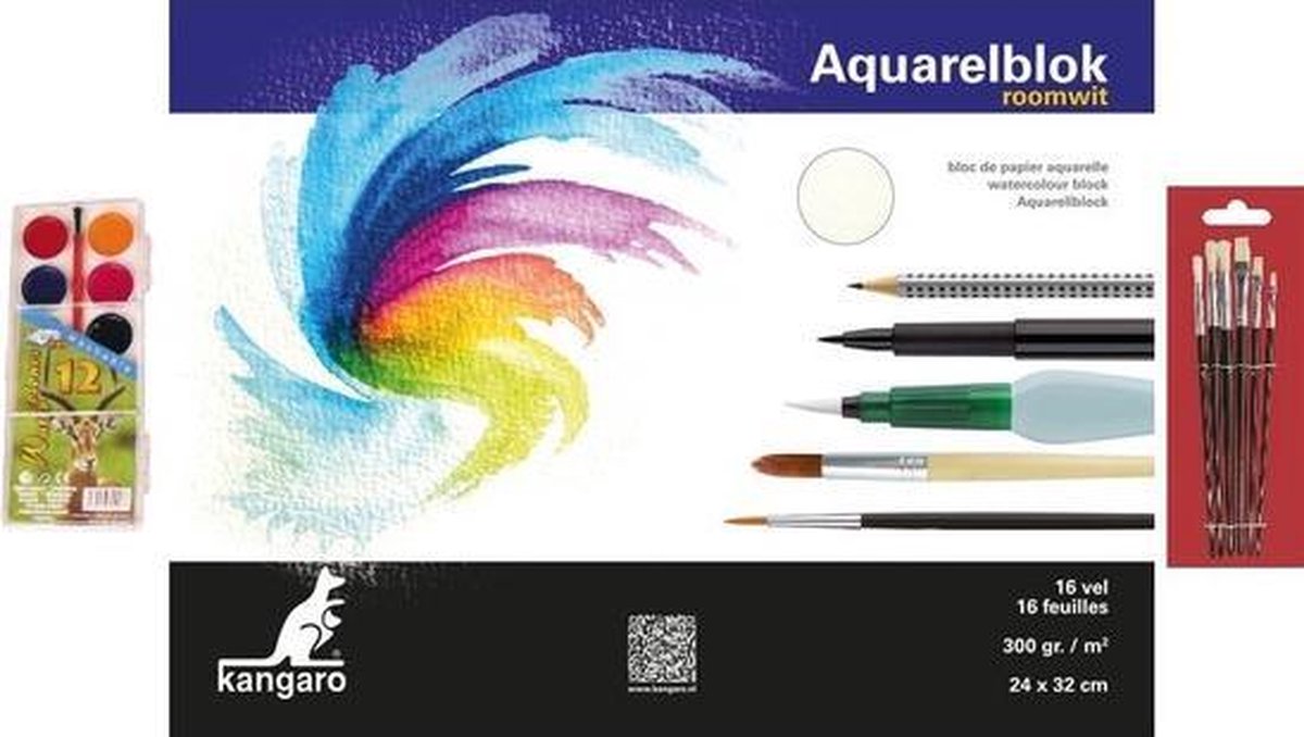 Schilderen waterverf set met 7 kwasten en aquarelblok 32 x 24 cm. Complete schilderset, bestaande uit: 1x palet met 12 verschillende kleuren waterverf en een kwastje, 1x 6-delige kwastenset en 1x aquarelblok. De kwastenset bestaat uit: 3 ronde penselen in maat 4, 6 en 8 en 3 platte penselen in maat 2, 4 en 6. De verf kunt u aanlengen met water. U kunt een kwast in een bakje of potje met water dopen, waarna de verf geactiveerd is en u kunt gaan verven/schilderen! Tevens geschikt om te gebruiken tijdens het schminken. Maak diverse creaties op het gezicht/lichaam met deze verf. Gemakkelijk afwasbaar met water (zeep naar wens). Materiaal verpakking en kwastje: kunststof. Aantal kwasten in meegeleverde set: 6. Aantal kleuren: 12. Formaat aquarelblok: 32 x 24 cm (tussen A4 en A3 formaat in). Materiaal aquarelblok: 300 grams kwaliteit, roomwit zuurvrij papier. Eenzijdig gelijmd langs de lange zijde. Het papier is uitermate geschikt voor aquarel, acryl, inkt, potlood, gouache en houtskool.