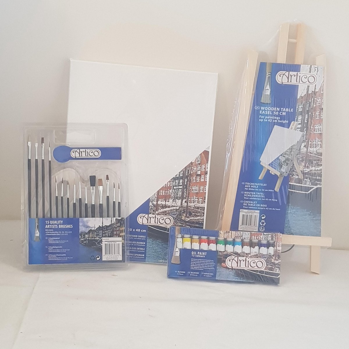 Artico schilderpakket bestaande uit: Olieverf 12-delig Penselenset met verfpalet 19-delig Canvas scildersdoek op frame 30x40 Schildersezel 50 cm