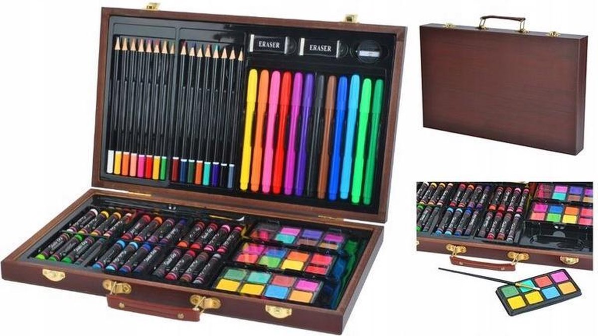 Een schilderij en tekenreeks is geweldig voor alle mensen die creatief bezig zijn en graag werken. Onze mega-set is uiterst functioneel en bevat 81 handige gebruiksvoorwerpen in een praktische houten kist. Een groot aantal pennen, kleuren en borstels maakt de implementatie van verschillende creatieve ideeën mogelijk. Met een enorme selectie van 24 kleurpotloden, 16 kleurpotloden, 24 aquarellen, 12 markeerstiften, 2 borstels, een puntenslijper en 2 gommen ben je goed voorbereid. Onze hoogwaardige materialen kunnen worden gebruikt om geavanceerde en mooie composities te maken. Alle onderdelen zijn ondergebracht in een elegante en praktische koffer. De koffer was aan beide zijden voorzien van inserts, waarbij elk element zijn eigen plaats heeft. De houten kist is extreem stabiel en heeft een comfortabele lederen hendel, zodat deze gemakkelijk kan worden getransporteerd. De stevig geklonken bevestigingsklemmen laten een veilige sluiting toe zonder dat de behuizing zichzelf opent door