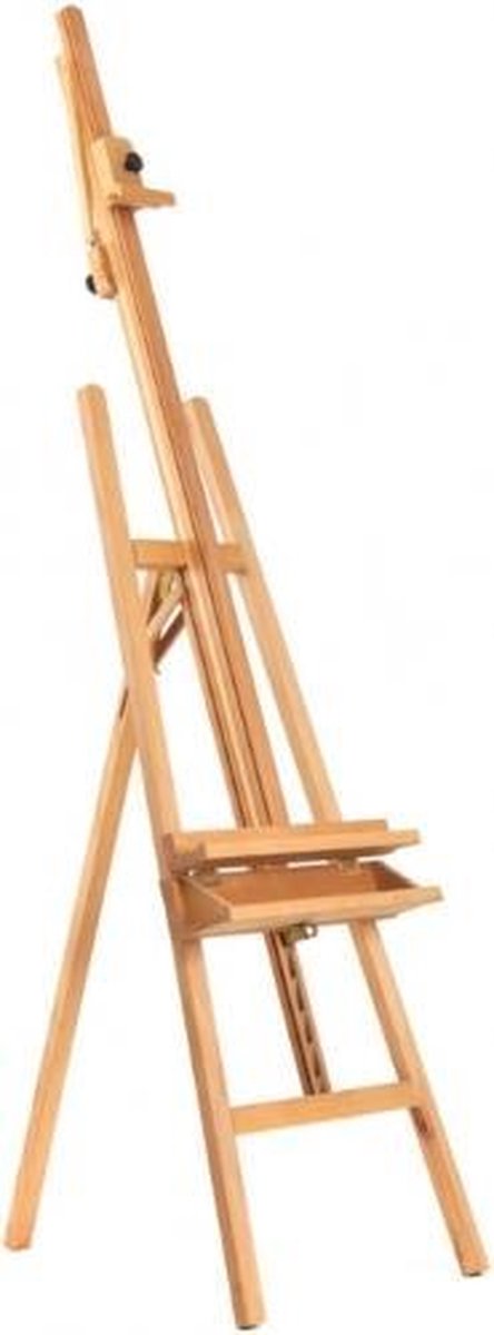 Aterlierschildersezel Cognac, Geolied Beukenhout zware kwaliteit, Traploos verstelbaar in hoogte, Verstelbaar in schuinte deze ezel kan ook recht op geschilderd worden, Penselenbak, Vloerbreedte 56cm, Vloerdiepte 55cm, Maximale doekhoogte 127cm, Afmetingen 178x58x18cm, Gewicht 8.6 kilo