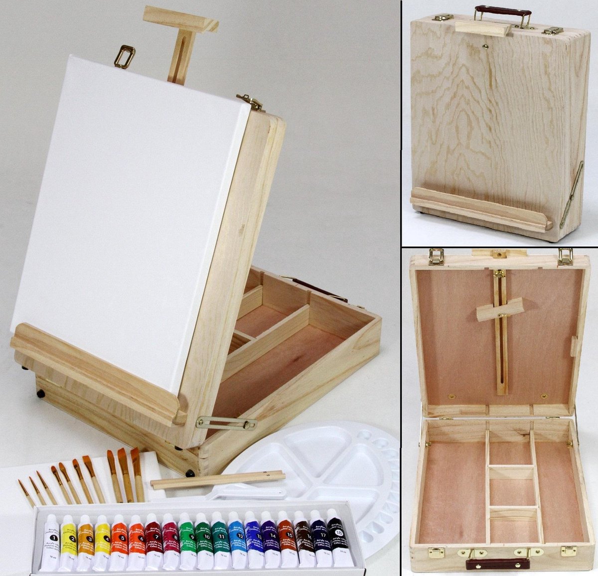 35-delige schilderset bestaande uit een: Tafelezel 45 x 33 x 13 cm 18 tubes acrylverf 18 ml Mengpalet en paletmes (kunststof) 5 penselen 2 schildersdoeken (25x30cm + 30x40cm) 2 potloden (2B)