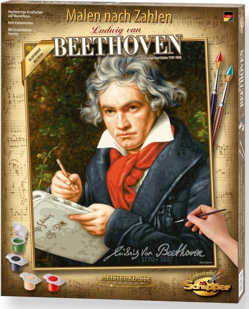 Ludwig van Beethoven (1770-1827) Deze belangrijke componist is tot op de dag van vandaag immens populair. Het bekende schilderij van Joseph Karl Stieler toont Beethoven op ongeveer vijftigjarige leeeftijd in een geïdealiseerde weergave tijdens het werk aan zijn beroemde compositie, de „Missa solemnis“. De afbeelding leeft van sterke contrasten. Het felle rood van de sjaal en het wit van de overhemdkraag onderstrepen het expressieve gezicht van de kunstenaar en verlenen het een opmerkelijke levendigheid en intensiteit. Het schilderij is een prachtig motief voor de hobbyschilder en tevens een waardig en stijlvol aandenken aan een uitzonderlijke kunstenaar en zijn grandioze muzikale werk. Een eerbetoon aan "Ludwig van Beethoven". Beeldformaat en schildervoorbeeld: “MEESTERKLASSE Premium”. Schilderijen in staand formaat of landschapsformaat van 40 x 50 cm, naast of onder elkaar gegroepeerd, zijn bijzonder geschikt voor een schilderijenverzameling. Het schildervoorbeeld heeft een
