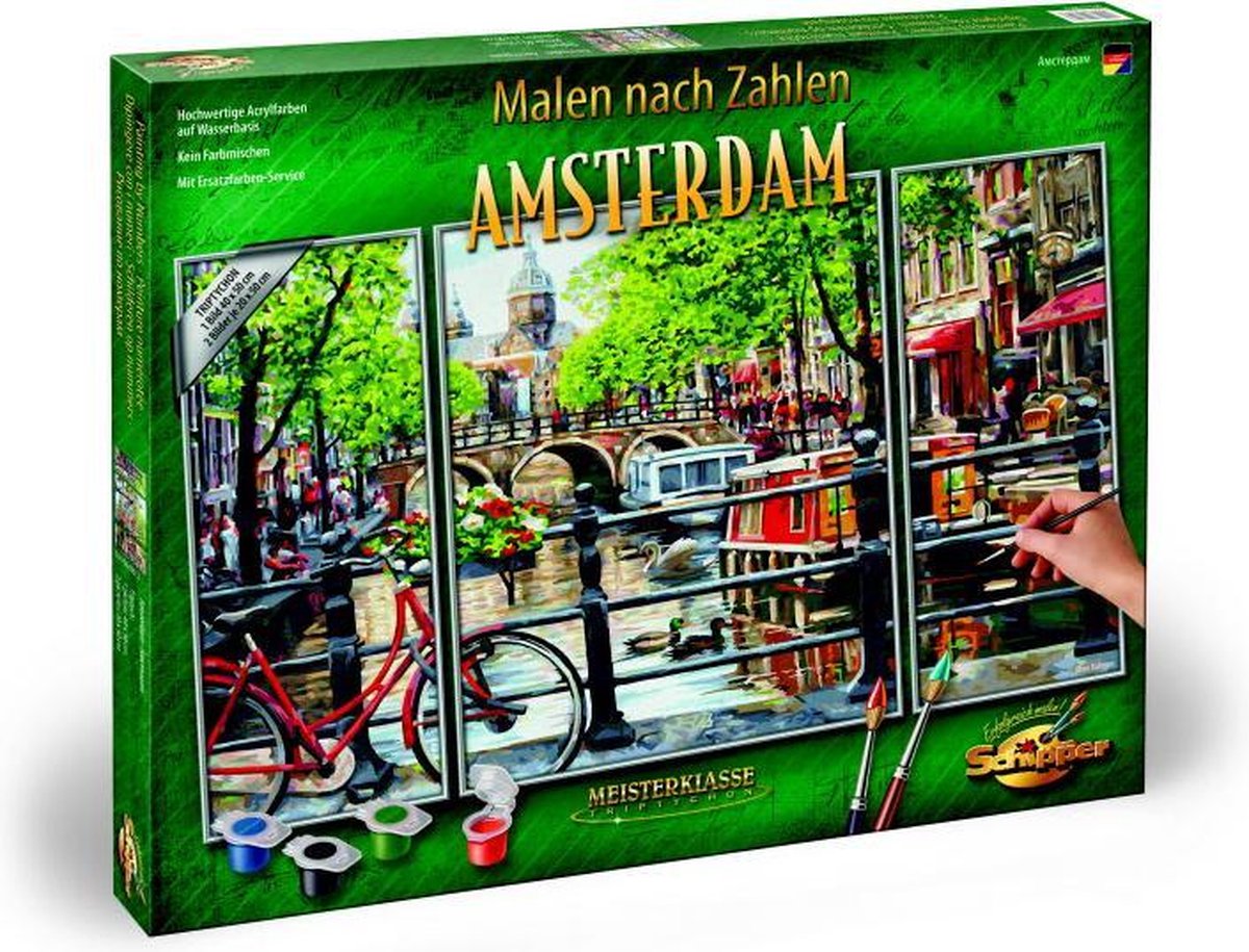 Schilderen op nummer van Schipper “Amsterdam - 3-luik”, is een creatieve bezigheid voor schilders van alle leeftijden. Met de methode "Schilderen op nummer" kan iedereen mooie schilderijen maken wanneer alle geconstrueerde en genummerde vakjes met de kleuren met hetzelfde getal worden beschilderd. Geschikt voor kinderen vanaf 14 jaar.