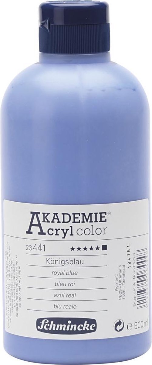 Schmincke AKADEMIE® Acryl color (500 ml) Topkwaliteit acrylverf die niet vervaagt, veel kleurpigmenten bevat en zijn levendige kleuren behoudt na het drogen. Aanbevolen voor zowel de ambitieuze beginner als de veeleisende kunstenaar. Kan verdund worden met water, gemengd worden met andere kleuren uit dezelfde serie en gebruikt worden op de meeste vetvrije oppervlakken.