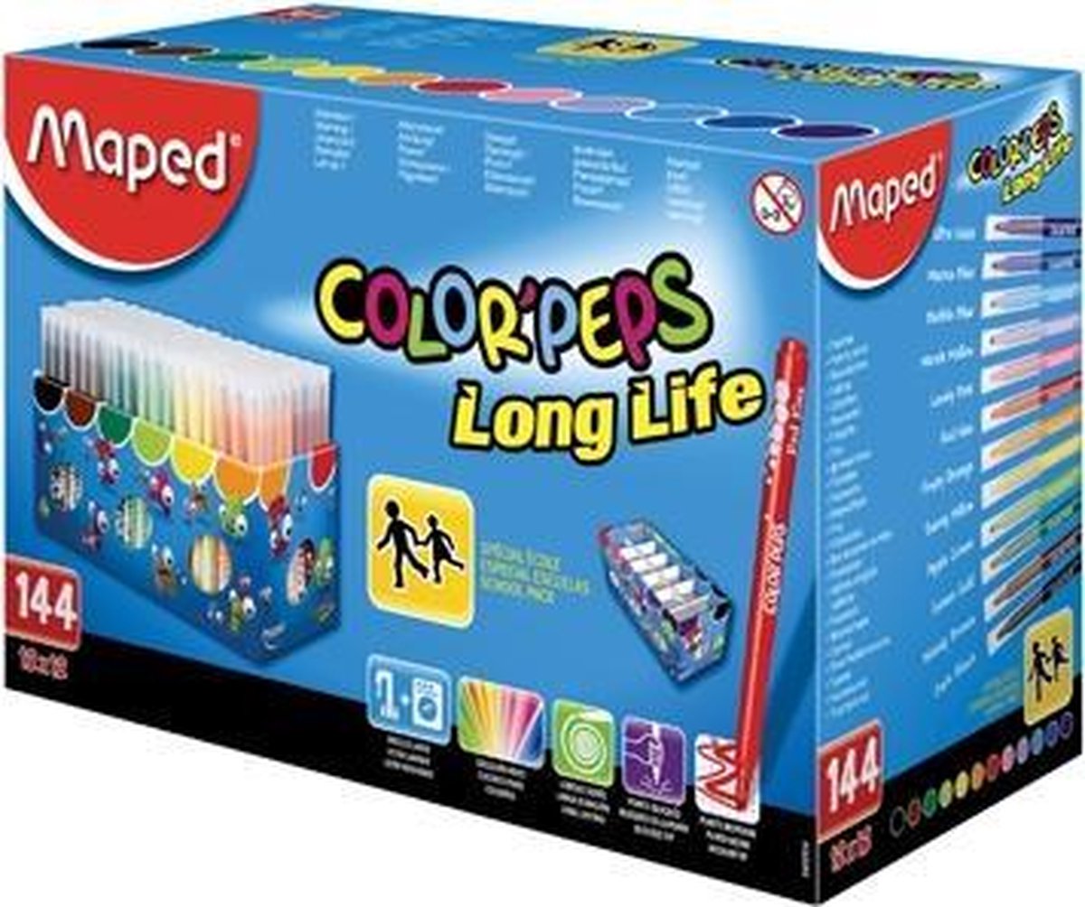 School'Peps kleurviltstiften Long Life in schoolverpakking x 144 Deze kleur viltstiften zijn uitermate geschikt voor kinderen. Door de ergonomische vorm van de viltstiften zijn ze zeer comfortabel in gebruik Vorm van de punt maakt zowel dun als dik kleuren mogelijk Deze kleurviltstiften voldoen aan de actuele speelgoedregulering Voorzien van een geventileerde dop Geblokte punt voorkomt naar binnen schieten van de punt Ultra uitwasbaar uit de meeste textielsoorten Van de handen afwasbaar met water en zeep na 1 keer wassen Lange levensduur voor lang kleurplezier Schrijflengte tot 300 meter Wordt geleverd in een stevige kartonnen doos