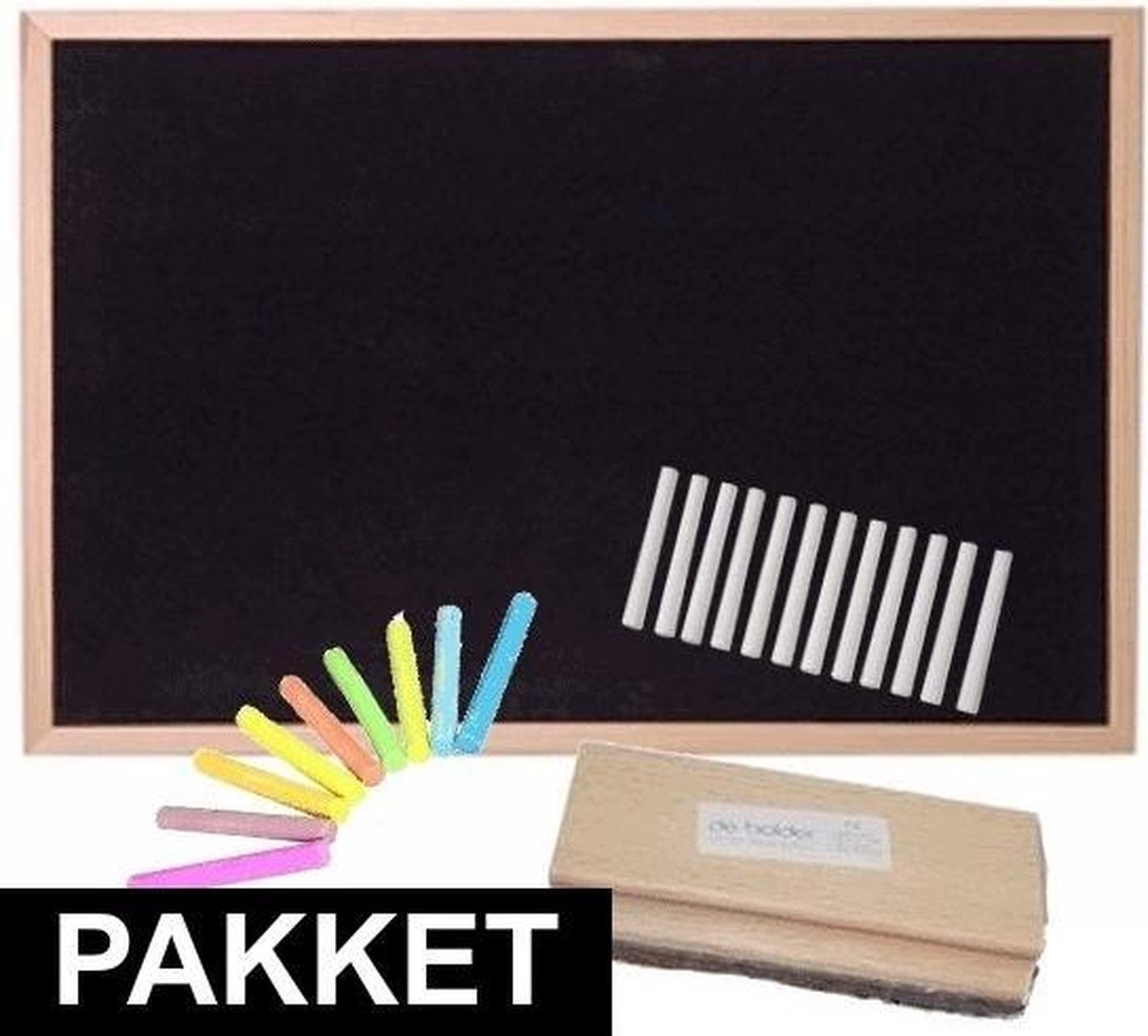 Krijtbord inclusief wisser en krijtjes. Krijtbord met een naturel lijst. Formaat: ongeveer 30 x 40 cm. Dit krijtbord word geleverd inclusief wisser en krijtjes. 12 witte en 12 gekleurde krijtjes. bestaande uit 1x Schoolbord krijt gekleurd 12 stuks, 1x Krijtbord 30 x 40 cm, 1x Voordelige krijtbord wisser , 1x Voordelig bordkrijt wit 12 stuks