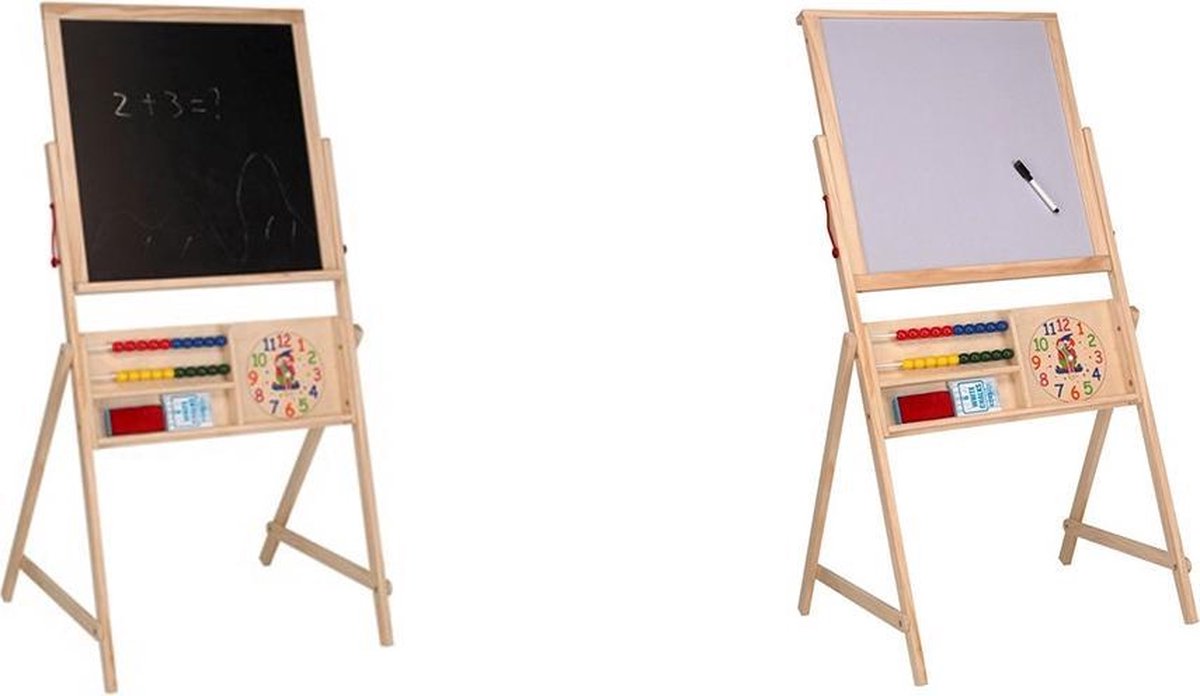 2-zijdig schoolbord met een krijtbord en een whiteboard Het bord kan eenvoudig omgeklapt worden en wordt gezekerd met een pin Voorzien van telraam en klok Wordt geleverd met 6 krijtjes, whiteboardstift en wisser Afmetingen: 53,5 x 107 x 51 cm