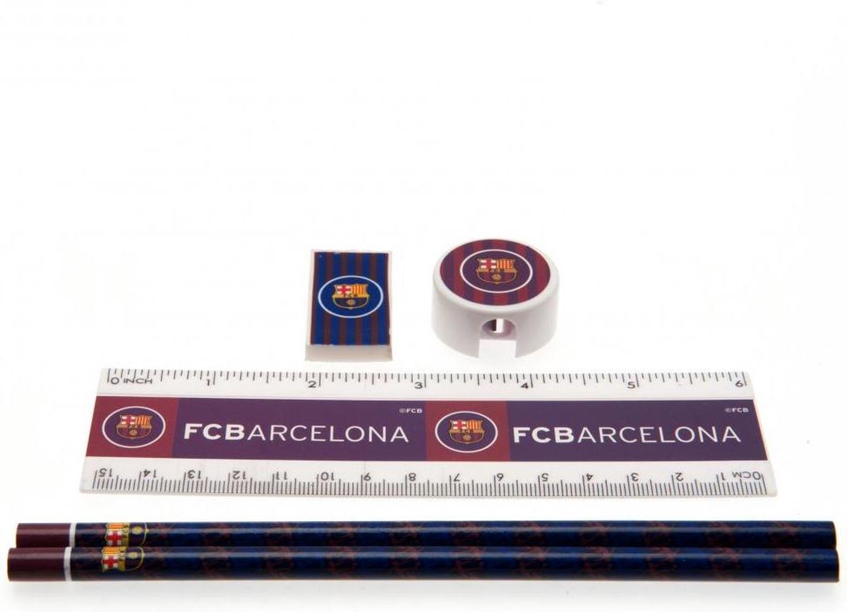 "Schrijfset barcelona 5-delig. Deze set in Barcalona stijl is gemaakt voor de jonge Bracalona fans. Ingebrepen zijn 2 potloden, een puntenslijper, een lineaal en een gum, Allemaal in de Barcelona kleuren en logo's!"