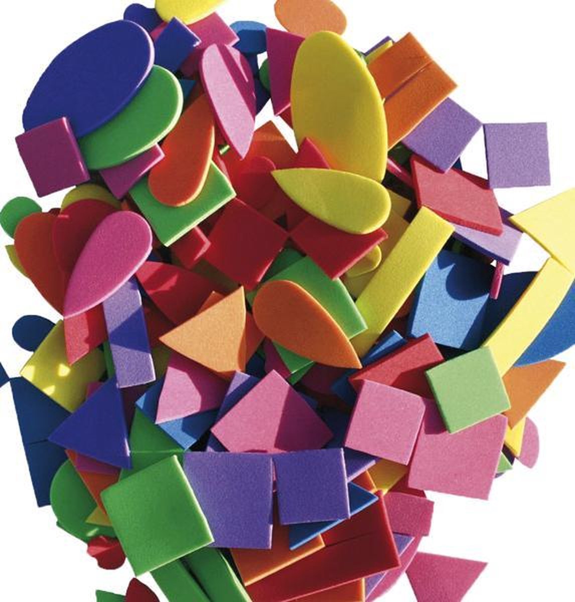 Schuimrubberen vierkanten, driehoeken, ovalen en druppels. Inhoud: 1000 onderdelen in 8 kleuren. Materiaal: EVA. Afmetingen: Ø 2-3 cm, 0,2 cm dik