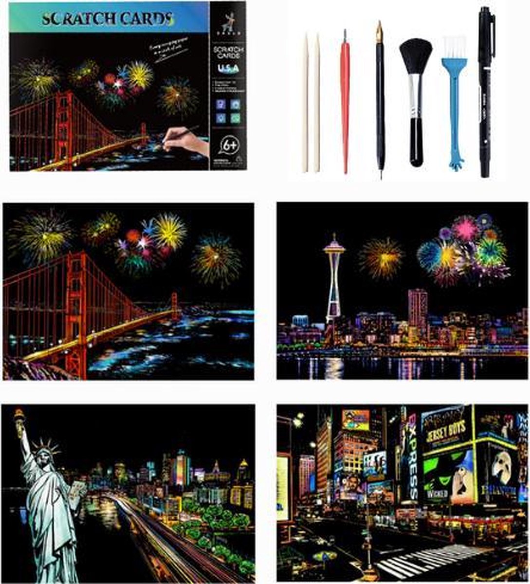 ?? Gratis verzending! De meest complete scratch art set aller tijden ! Deze set bevat niet alleen 4 prachtige kraskunstwerken in thema, maar óók een uitgebreide 7-in-1 gereedschappen set in handige hersluitbare verpakking. Onze sets garanderen urenlang plezier voor jong en oud, ervaren en onervaren, met als resultaat prachtig kleurrijke kunstwerken om in te lijsten, op te hangen of cadeau te geven. Hoe werkt scratch art? Heel eenvoudig! Kras met de bijgeleverde gereedschappen zo zorgvuldig alle grijze vlakken in de afbeeldingen weg om een prachtig kleurrijk kunstwerk zichtbaar te krijgen. Urenlang plezier gegarandeerd voor bijna iedereen met de leeftijd 9-99 jaar. Deze set in het thema "U.S.A." bevat het volgende: - 4 prachtige A4 thema krastekeningen - 7 stuks kras gereedschap in handige hersluitbare verpakking